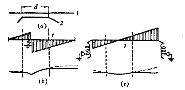 經(jīng)消弧線圈接地在這方面具有明顯的優(yōu)越性,因?yàn)楫?dāng)補(bǔ)償電網(wǎng)中發(fā)生一相接地故障時(shí),烕應(yīng)回路和電流在其中的分布都是受到控制的,而和接地的地點(diǎn)無(wú)關(guān),所以就可以設(shè)法使電磁烕應(yīng)分解為兩個(gè)彼此抵銷的分量。這一點(diǎn)可以用圖5-1來(lái)加以設(shè)明,其中(c)圖表示一條輸電線路1和一條通訊線路2在一段長(zhǎng)度d內(nèi)彼此靠近的情況;(6)圖為沒(méi)有消弧線圈(中性點(diǎn)不接地)時(shí)的接地電容電流的分布狀況。